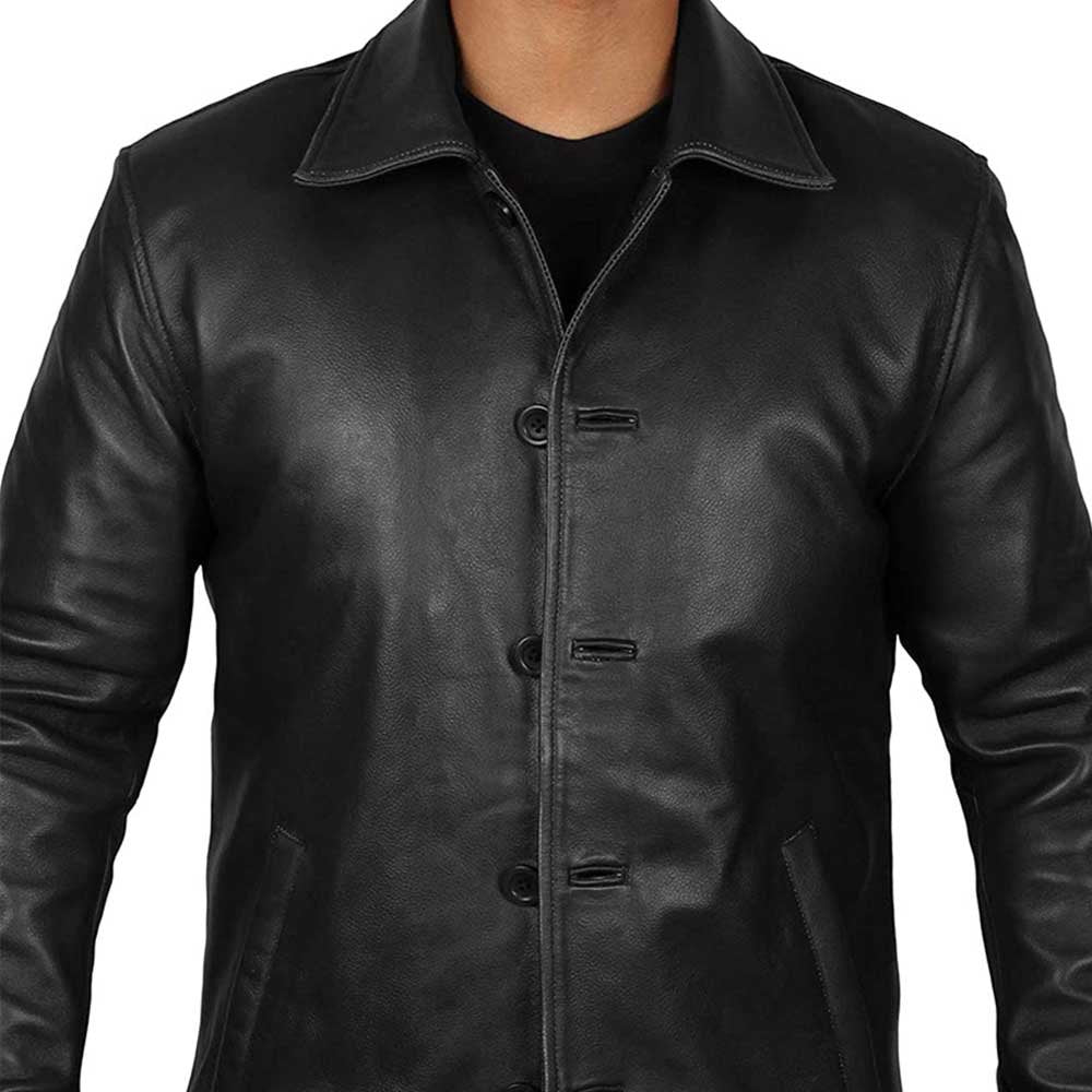 • This leather coat on the front is adorned with a button closure that gives durability and easy usability for those who choose to style themselves with buttoned jackets.