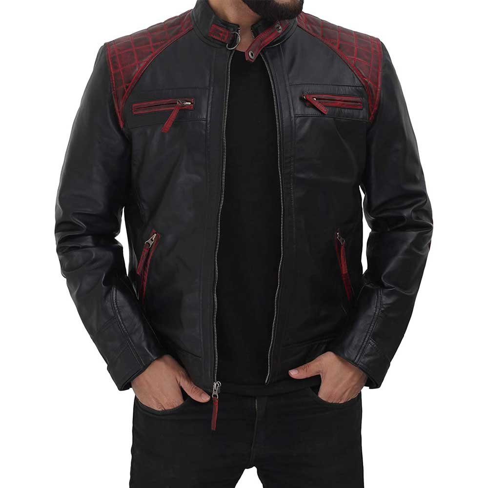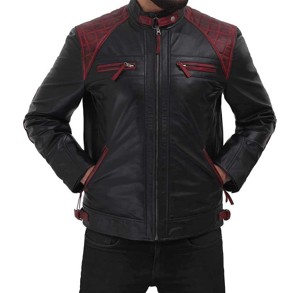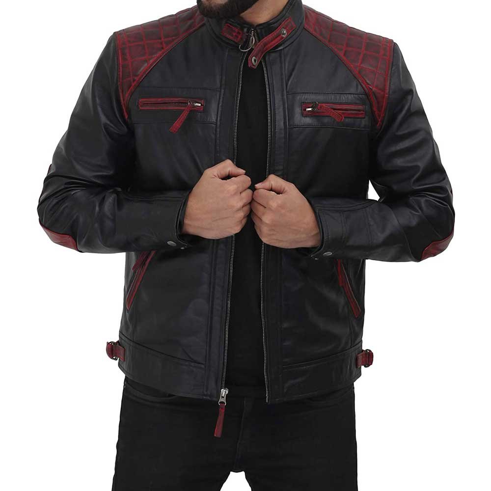 Black and maroon leather moto biker jacket for men features a front zipper closure with multiple chest pockets, snap tab collar, soft internal viscose lining, and premium stitching throughout the jacket.